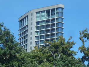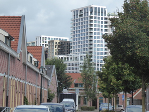 Rechtse gebouw is de Regent en links ernaast is de Admirant, 5 sept 2025. Vooraan de Immanuelkerk in Veldhoven(Hervormd). Links de Christus Koningskerk in Veldhoven