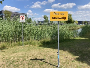 Informatiebord. Voorzicht in vennen en stilstaande plassen. Blauwalg 9 juli 2025