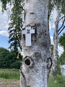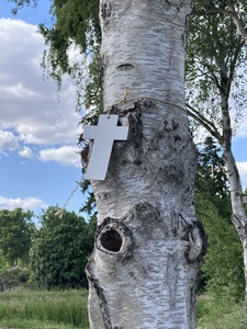 Een kruisje in een boom in het Dommeldal Waalre. Vreemd In het Dommeldal iets voor het brugje wat over de Dommel loopt. Het pad komt uit op de Nagelmekerseweg. Je kan er mooi asml zien liggen. 8 mei 2025